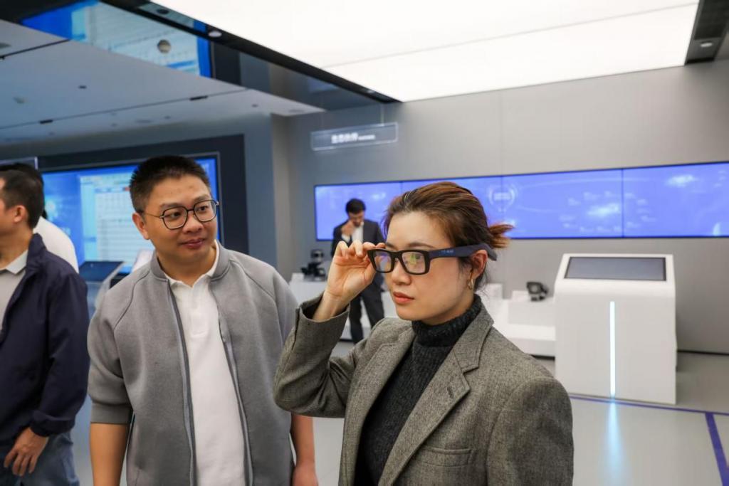 圖說:與會人員饒有興致地體驗(yàn) AI 眼鏡